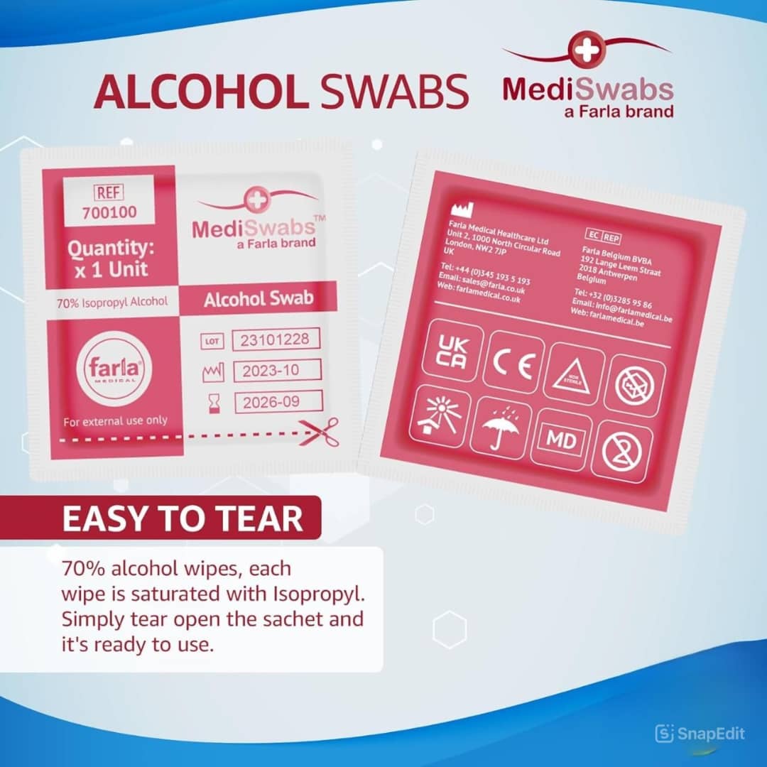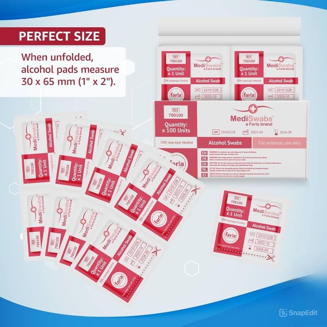 مسحات طبية معقمة عالية الجودة، مخصصة لتعقيم الجلد وتنظيف المناطق المراد حقنها أو فحصها طبيًا. تأتي مغلفة بشكل فردي للحفاظ على أعلى درجات التعقيم والسلامة، مما يجعلها مناسبة للاستخدام المنزلي والمهني.